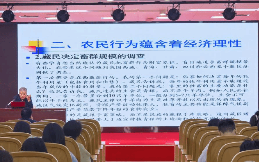 10月28日上午,“林宽讲堂”专题学术报告在安农九华山路校区综合楼三楼报告厅举行,报告由副经理李坦主持,经理杨波及学院100余名师生参加。报告中,李周以 “农民行为中的经济学理性 —— 田野调查中的收获”为题,结合自身长期扎根中国农村的田野调查实践,系统阐释了农民行为中的经济学逻辑。他指出,理解“三农”问题的关键在于深入分析农民在现实约束条件下的理性选择过程,必须从农民实际行为出发,把握乡村社会的运行机制。他强调,传统经济学中的理性假设应当在具体的乡村社会语境中加以修正与再解释;田野调查不仅是获取数据的手段,更是发现新问题、提出新理论的重要途径。最后,他以西藏、青海、甘肃、四川和云南等地的调研为例,揭示了农民行为中所蕴含的经济理性机制与深层逻辑。