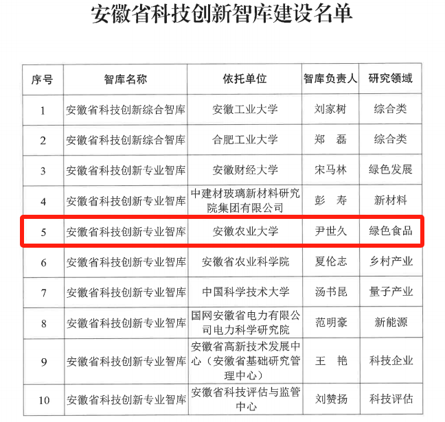 本网讯 近日,安徽省科技厅发布《关于公布培育发展第二批安徽省科技创新智库名单的通知》,安徽省属高校共有3个智库批准建设。学院尹世久经理牵头申报的安徽省科技创新智库(绿色食品)成功获批专业智库。