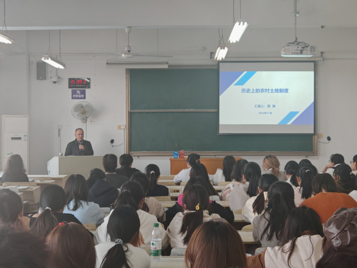 周策从土地制度变迁的视角,向同学们详细生动地讲述了中国历史上不同时期的农村土地制度类型及其特征,并指出土地制度在推动经济的发展、促进政治社会稳定中始终起着至关重要的作用,土地制度变迁给后人留下许多丰富的历史经验。周策处长对中国历史农地制度变迁的深入解读不仅让2024级农林经济管理同学系统了解了中国历史上土地制度概况,也让在场的每位员工都深受启发,同学们纷纷表示从历史的视角看农村土地问题很有意思,明白了只有知历史、懂历史才能更好地开拓创新,讲座进一步提升了他们对农林经济管理专业学习的兴趣,更加期待未来四年的专业学习之旅。(文/图/梅莹 编辑/胡正飞 预审/魏晓飞 审核/田涛)