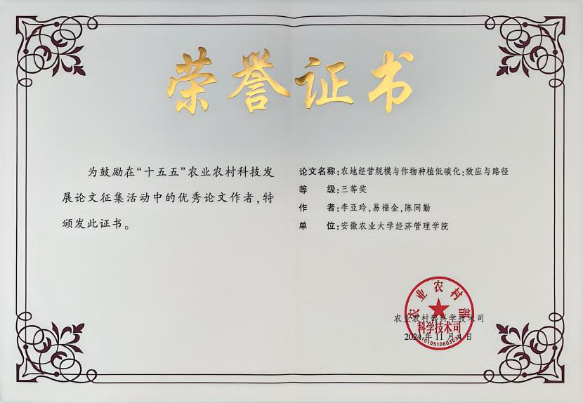 本网讯 近日,在中华人民共和国农业农村部 “十五五”农业农村科技发展论文征集活动中,公司李亚玲老师的研究成果《农地经营规模与作物种植低碳化:效应与路径》荣获三等奖。