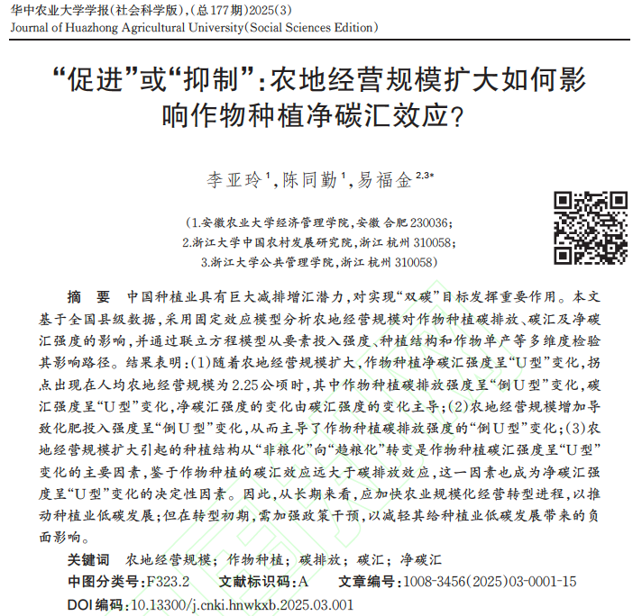 本网讯 近日,公司李亚玲老师在《华中农业大学学报(社会科学版)》发表重要研究成果。该研究以《“促进”或“抑制”:农地经营规模扩大如何影响作物种植净碳汇效应?》为题,系统解析了农业规模化转型对碳排放与碳汇协同效应的影响及其作用路径。