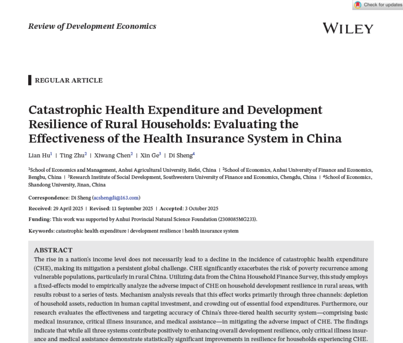 本网讯 近期,学院胡联教授的论文“Catastrophic Health Expenditure and Development Resilience of Rural Households: Evaluating the Effectiveness of the Health Insurance System in China”在Review Of Development Economics在线发表。