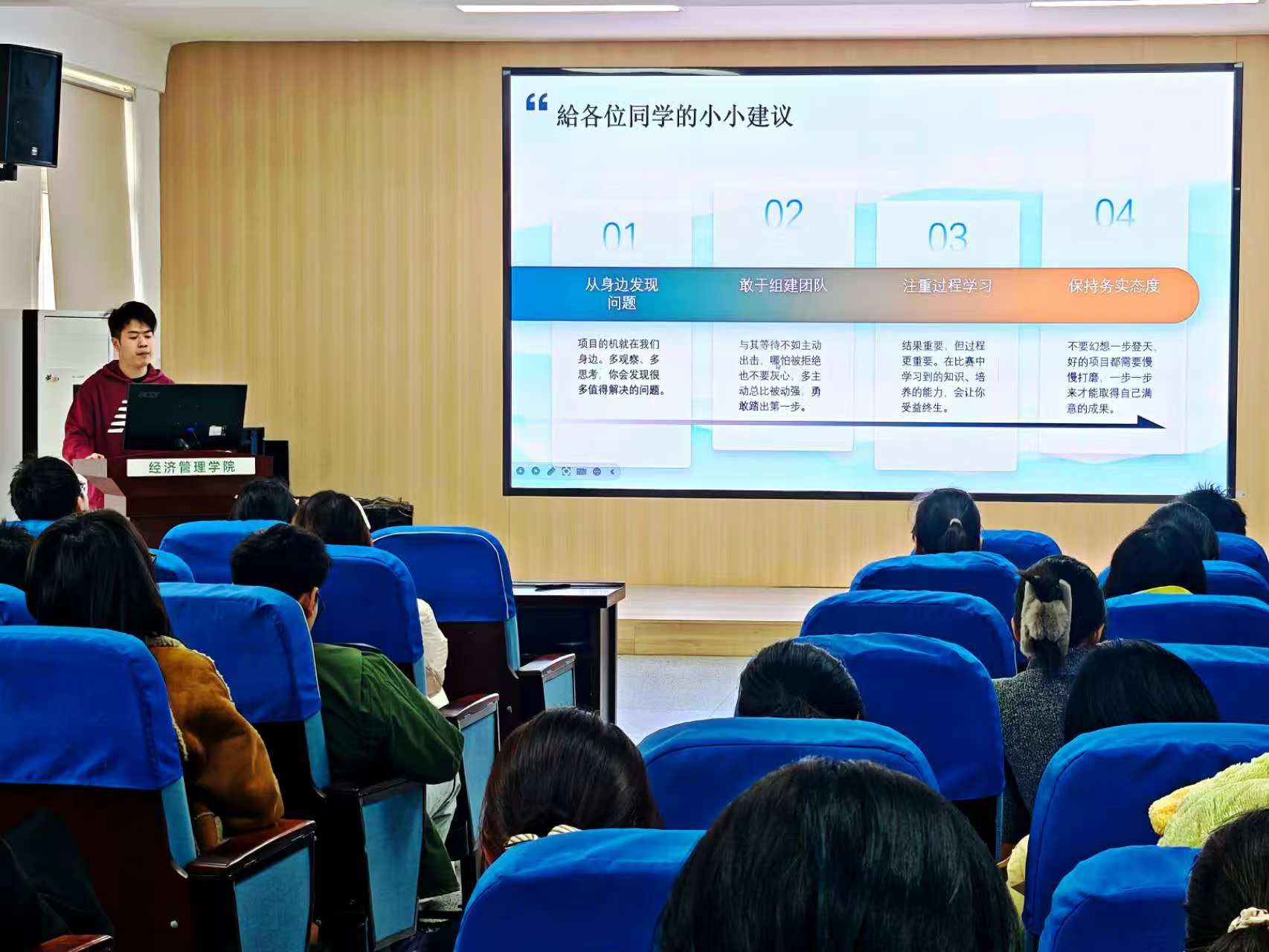 分享会现场,学院学科竞赛负责老师梳理大赛核心要求与重点内容,鼓励同学们结合专业所学参与比赛。来自tyc8722太阳集团金融学专业的康程同学结合自身备赛、参赛经历,从项目选题、方案撰写、团队协作和发展规划四个方面,分享了参与乡村振兴创新创业大赛的实战经验,并针对赛事中的难点给出了应对建议。在场员工认真聆听,积极提问,现场氛围浓厚。