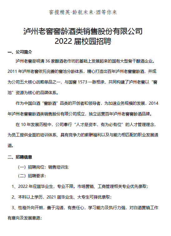 【招聘简章】泸州老窖窖龄酒类销售股份有限公司