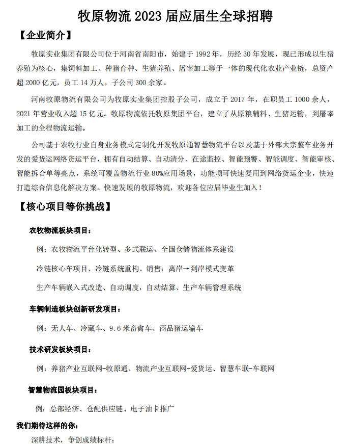 【招聘简章】河南牧原物流有限公司