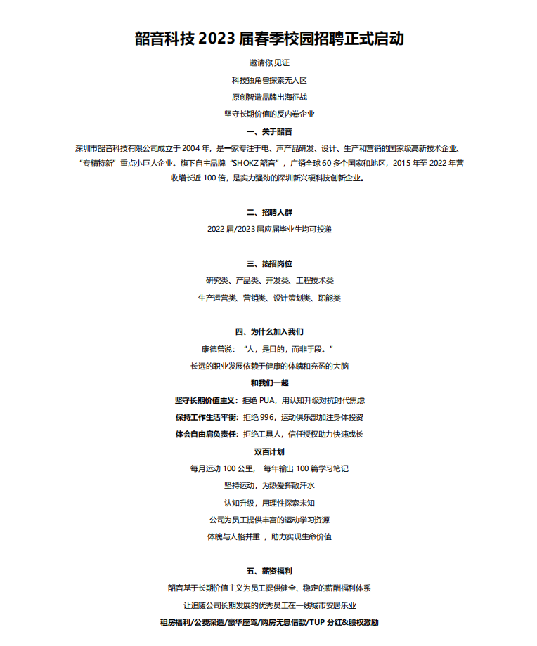 【招聘简章】深圳市韶音科技有限公司