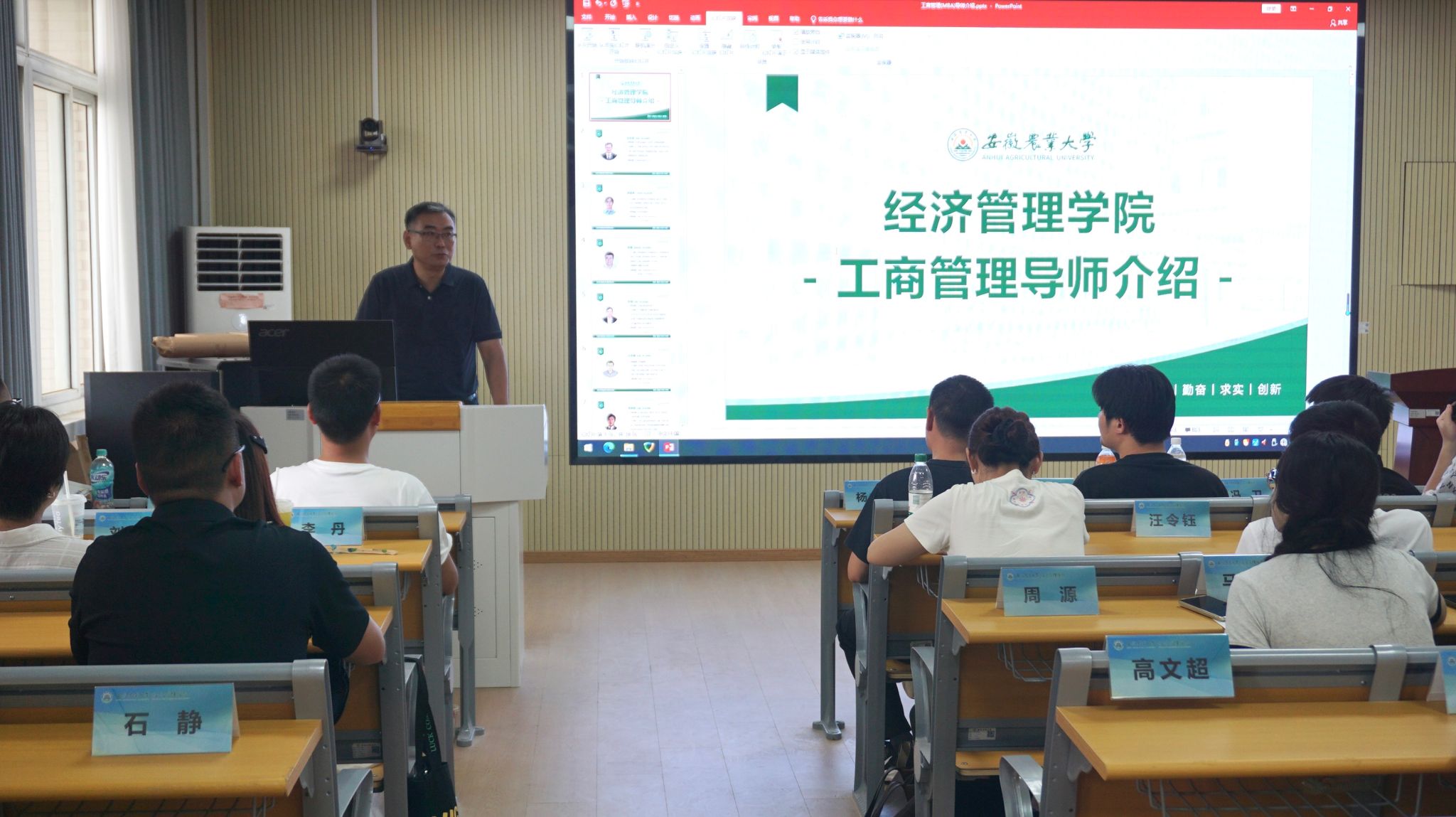 会上,田涛首先致欢迎辞。他代表学院对MBA新生的到来表示热烈祝贺和诚挚欢迎,并介绍了学院深厚的历史底蕴、卓越的团队力量以及MBA项目的培养理念与计划。他指出MBA学习不仅是知识的深化,更是人脉的拓展、视野的开阔和能力的全面提升。他鼓励同学们珍惜重返校园的宝贵时光,在未来两年的学习生涯中,积极参与课堂讨论、案例竞赛和各类课外活动,主动与来自不同行业背景的同学交流互鉴,在安农收获更多的知识与本领,自信迈向更广阔的天地。为便于同学尽快开展导师双选活动,田涛还对学院所配备的工商管理导师进行了详细介绍。