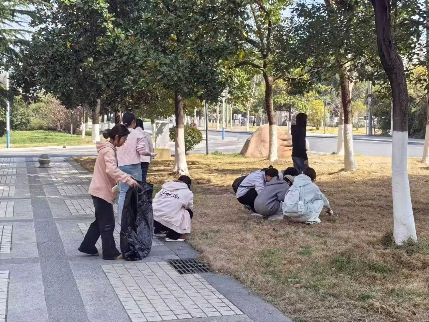 活动中,志愿者们手持垃圾袋、清洁夹等工具,分组前往绿化带、人行道及经管楼周边区域,开启细致的清扫工作。大家弯腰俯身,仔细捡拾枯枝落叶、纸屑杂物,耐心清理卫生死角。春日暖阳下,志愿者们穿梭于草木间,用双手为校园拂去尘埃,用汗水诠释着“奉献、友爱、互助、进步”的志愿精神,成为校园里一道温暖而生动的风景。