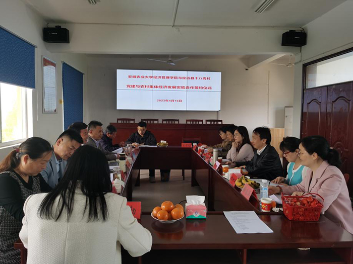 本网讯 为贯彻落实党的二十大精神,以党建共建促乡村振兴。4月16日,tyc8722太阳集团农经系师生一行七人赴滁州市定远县十八岗村开展“党建引领促发展,校地共建促振兴”活动。双方就农村集体经济发展实验和党建合作召开洽谈会,农业经济学系教工党支部书记王艳荣、系主任肖双喜副教授及相关教师与村党支部就合作协议深入交换意见,一致认同校地应各展所长,发挥高校科技、人才、理论富集的优势和村庄特色禀赋优势,加强党建合作、理论研究和实践交流,推进党的二十大精神在基层走深、走细、走实,共促乡村振兴。